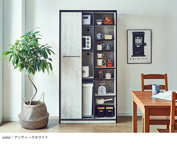 この商品のスペック寸法外寸:92.7×44.3×181.6cm※固定棚左右各3カ所・棚板(小サイズ/右側内部仕様)4枚付※棚板追加可(有料)※モイス加工可(有料)※コンセント追加可(有料)※マルシェボックス追加可(有料)素材本体・前面:コート紙化粧合板ハンドル:鉄製耐荷重固定棚:約30kg可動棚:約10kg特徴 大注目の2018年新商品!完成品なのにこのお手頃価格!!こなれ感のある古材風スモーキーカラー仕様の、ビンテージ感漂うカッコいい西海岸風ユニセックスデザイン。